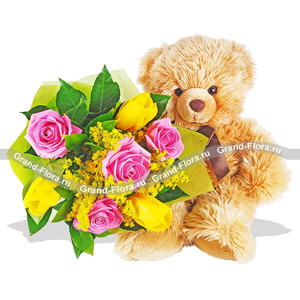 Стандартный: роза розовая - 6 шт., тюлпаны желтые - 5 шт., солидаго - 4 шт., декоративная зелень, фетр желтый + мягкая игрушка "Медведь" - 25-30 см.